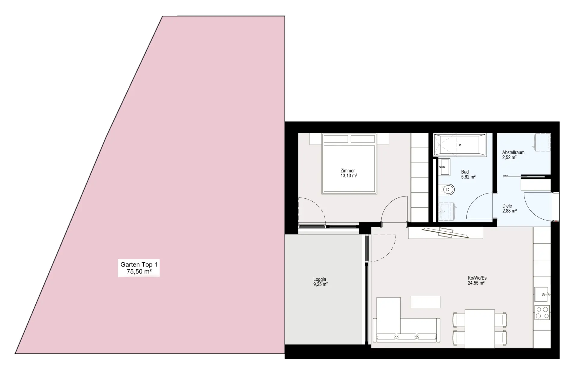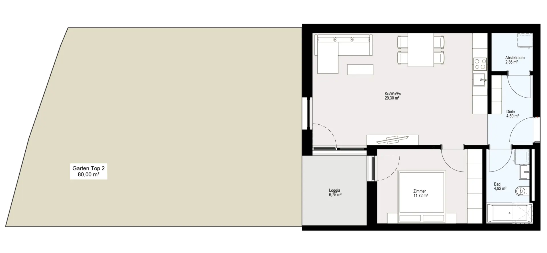 Perfekt für den Start ins Eigentum: Die 2-Zimmer-Wohnung “Top 01” mit 49 m² ist dank großem Privatgarten ein besonderes Highlight. Genieße deinen eigenen Platz im Grünen.