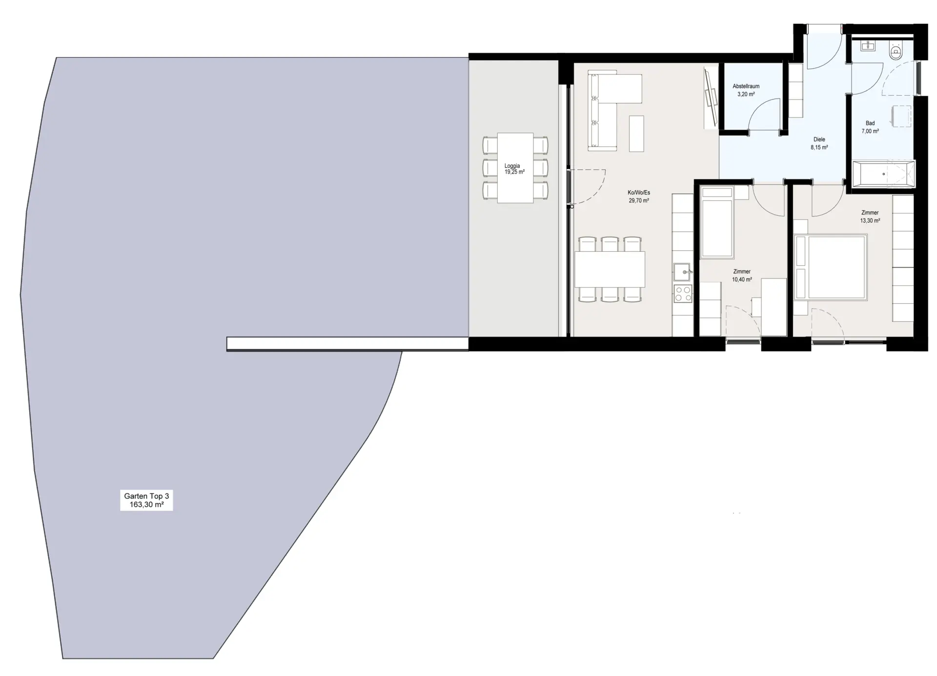 Die 72 m² große Wohnung “Top 03” überzeugt mit ihren 3 Zimmern mit großem Garten und viel Privatsphäre. So wird die Wohnung zum ideale, sichere Hafen für dein Familienglück.