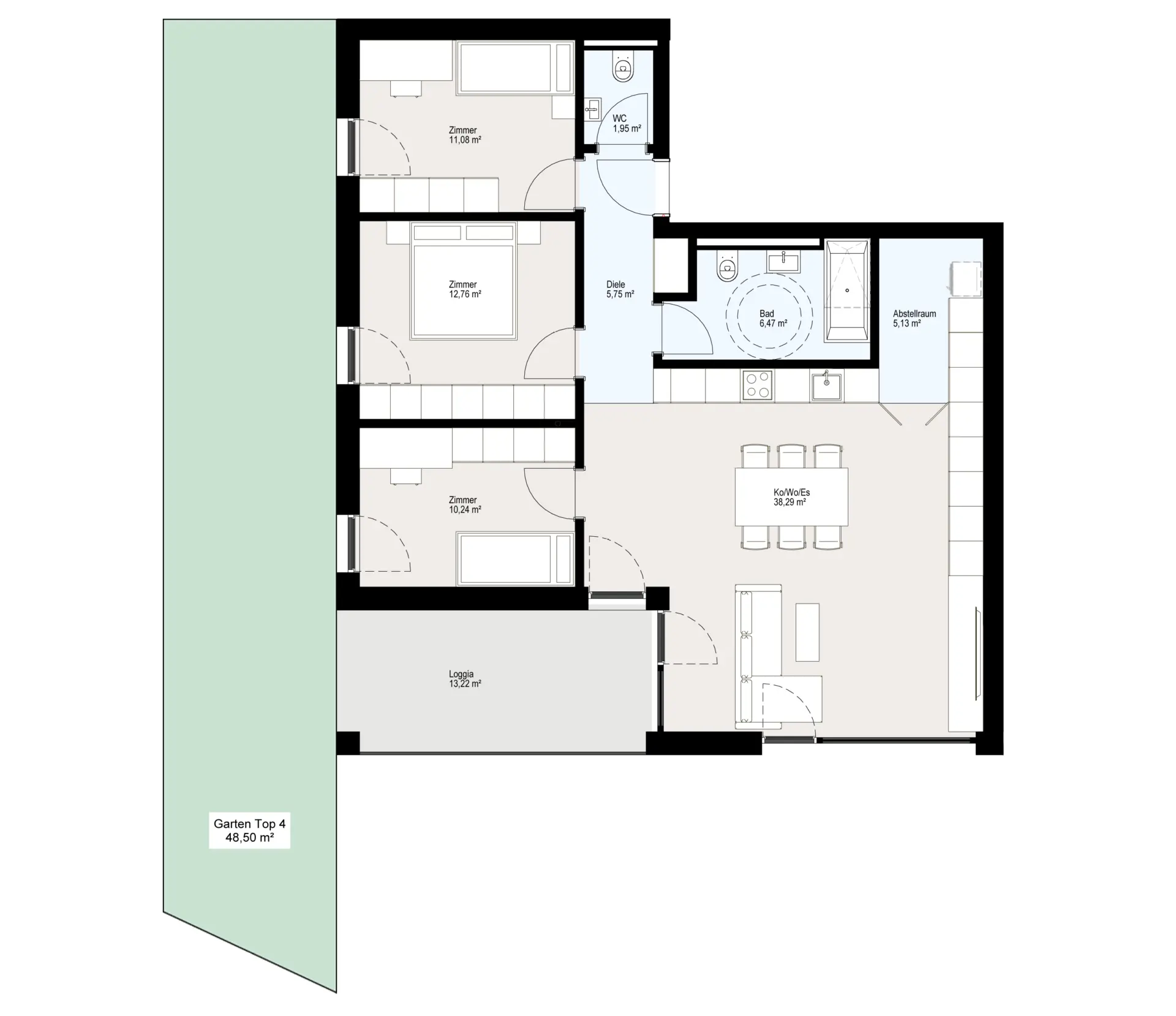 Wohnen und Arbeiten perfekt vereint. Ein Zimmer als Büro, das andere privat. Die 4-Zimmer-Einheit “Top 04” bietet mit 92 m² die Flexibilität, die modernes Arbeiten erfordert – plus Garten für die Kaffeepause.