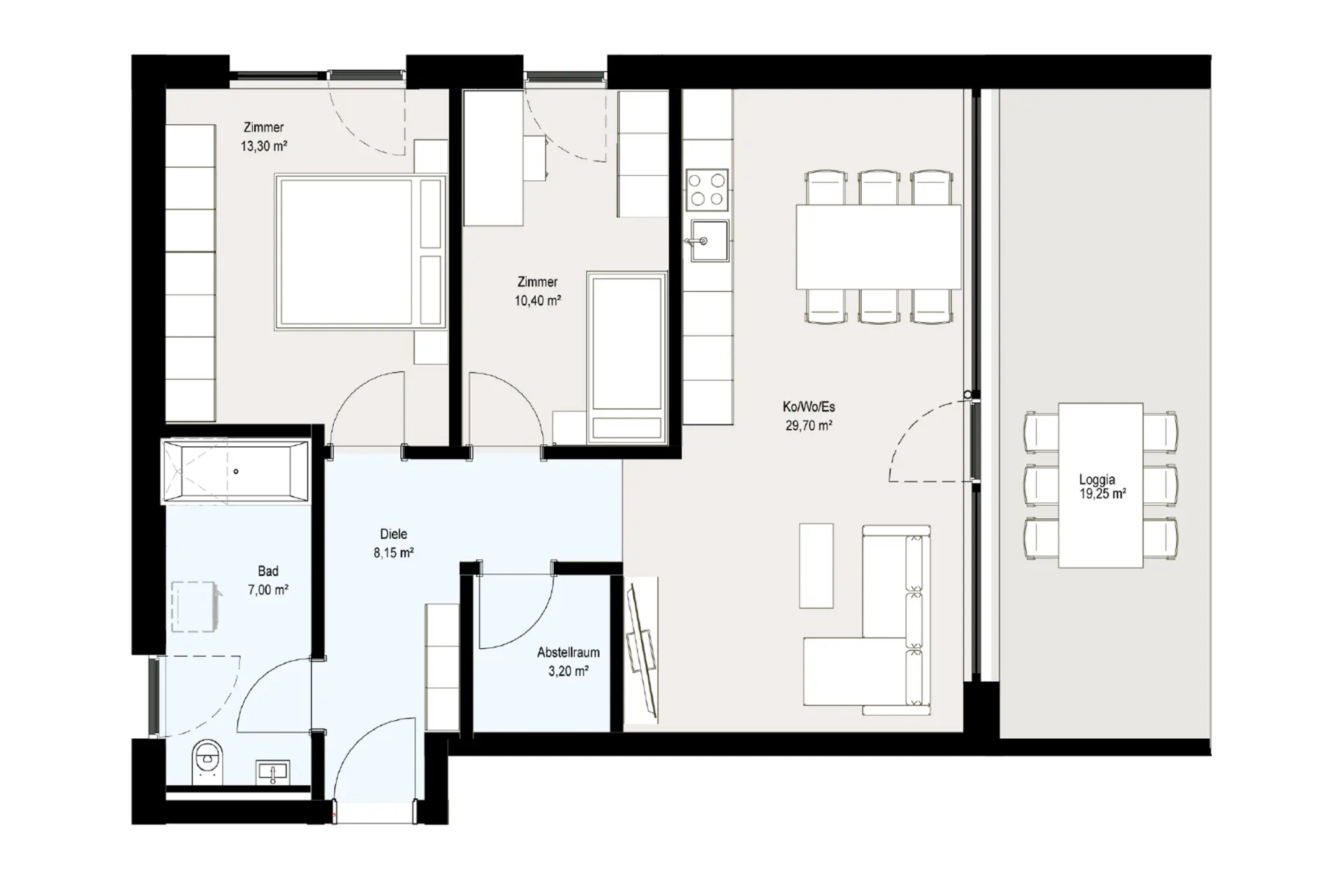 Großzügiger Wohn-Ess-Bereich für Gäste, ein Schlafzimmer und eine großzügige Loggia. Die 2-Zimmer-Wohnung “Top 05” mit 53 m² bietet Luxus und Freiraum für einen individuellen Lebensstil.